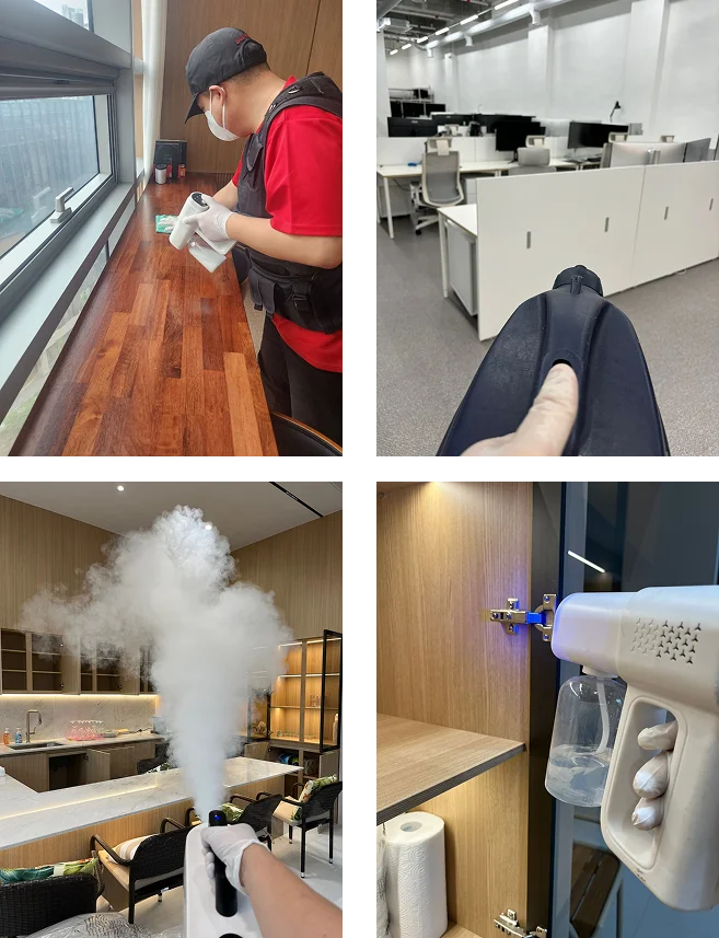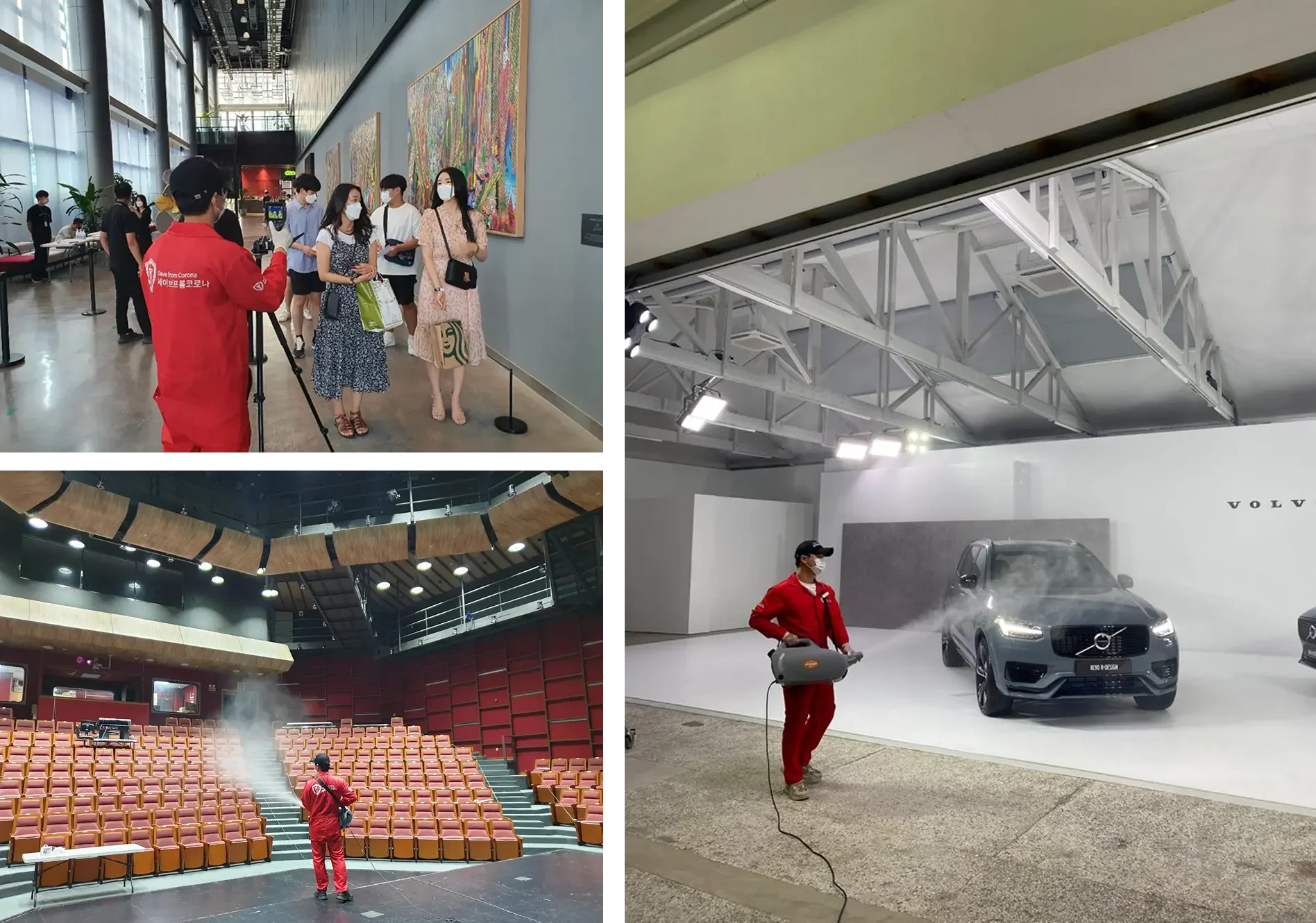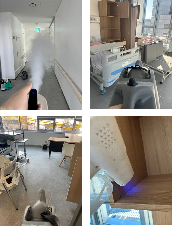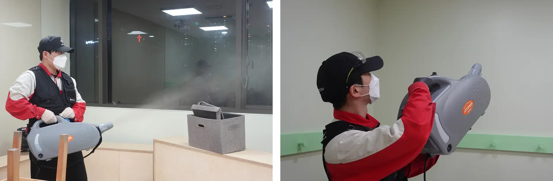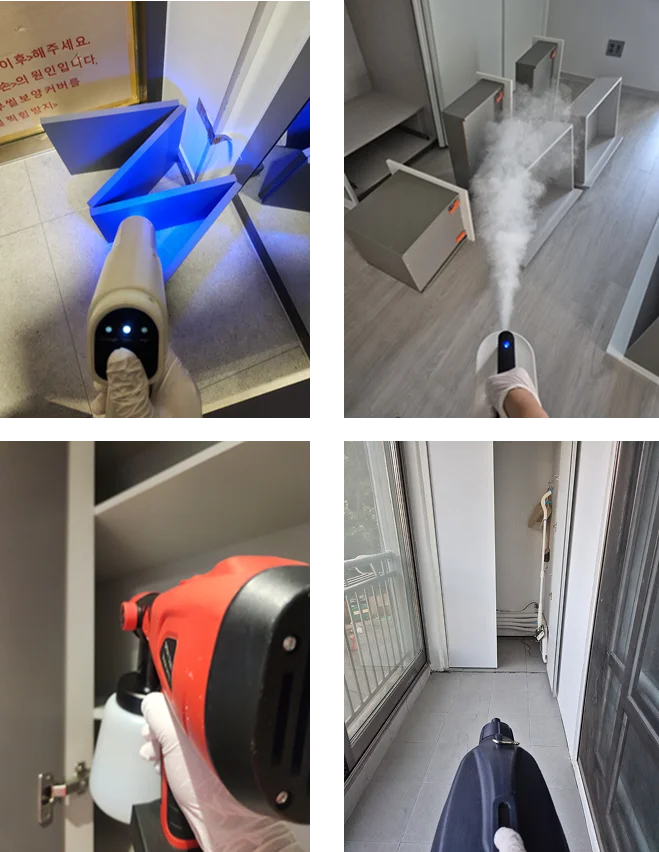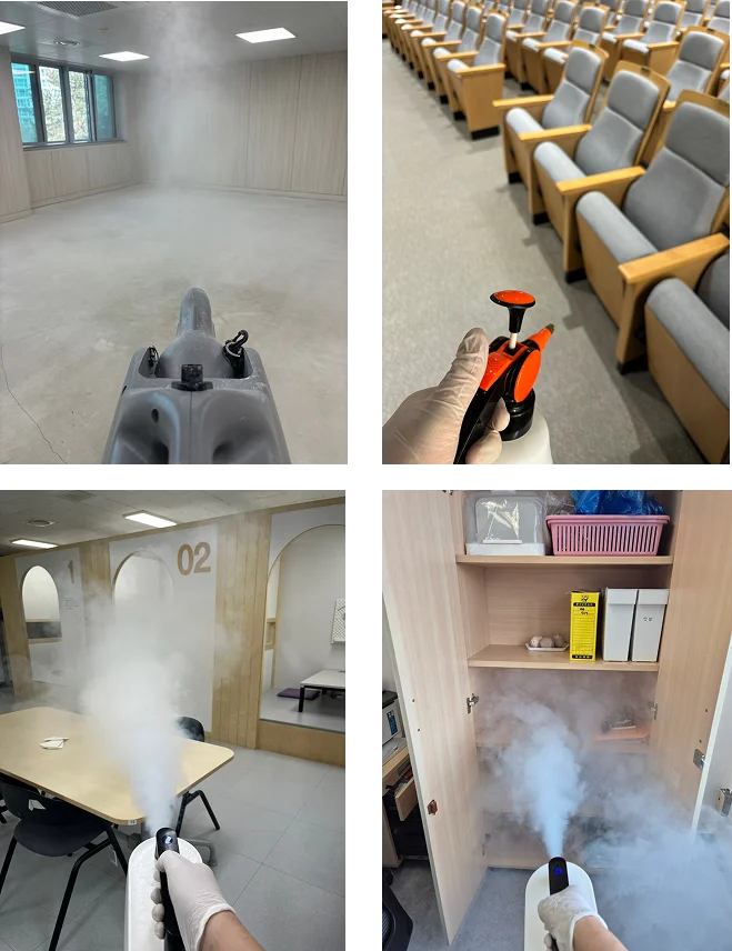 실내 전체에 고농도 오존을 확산시켜 잔여 악취 및 유해물질 등 멸균하는 시공으로 12시간 이상 밀폐 된 공간을 유지합니다.