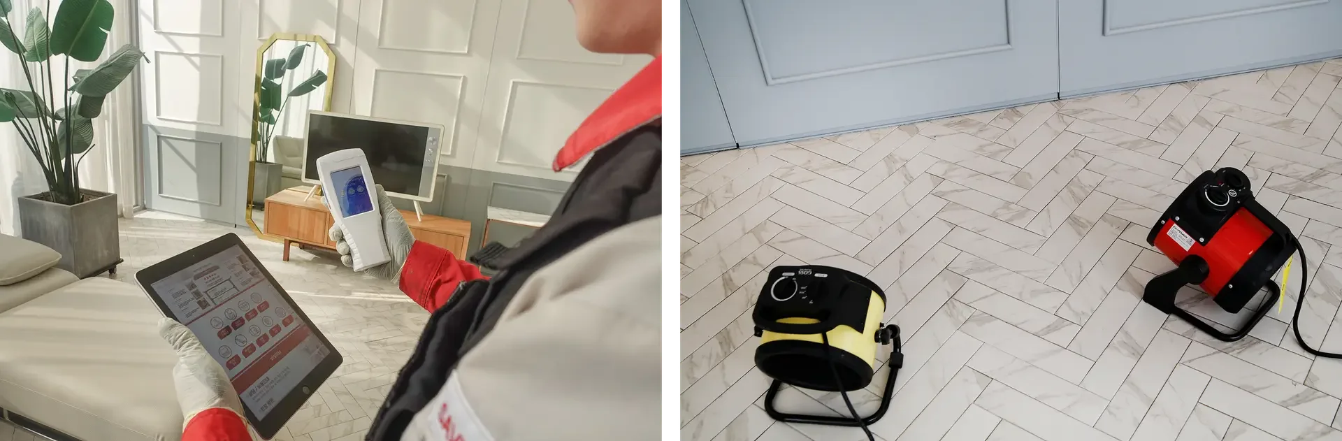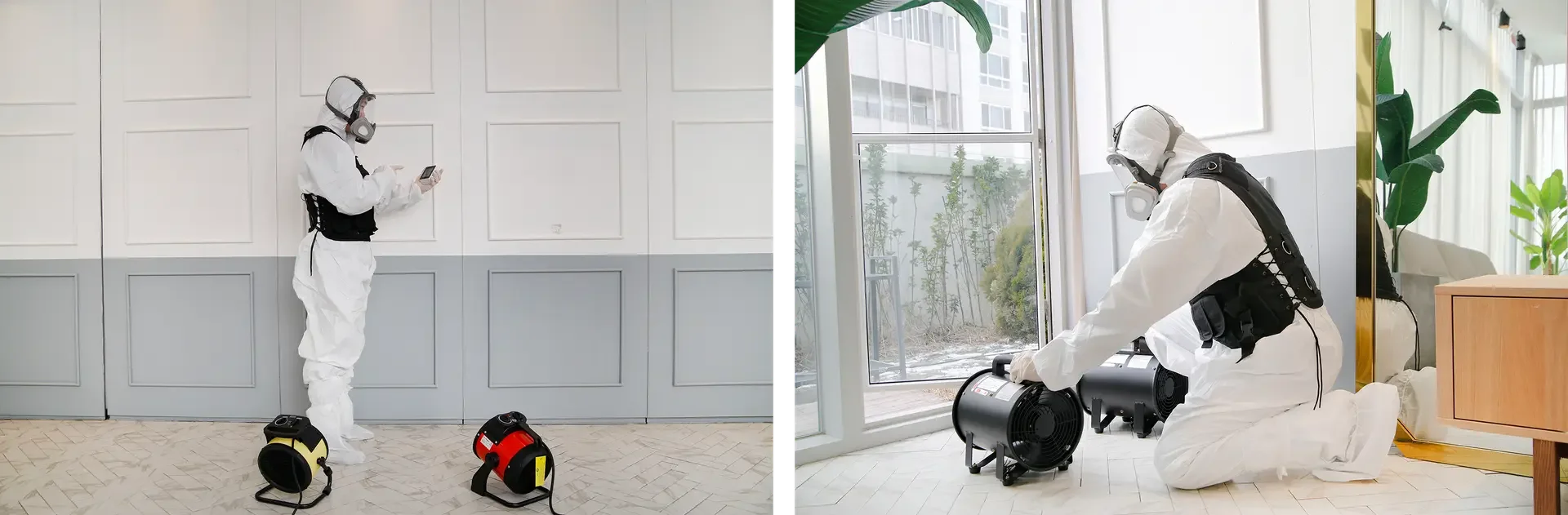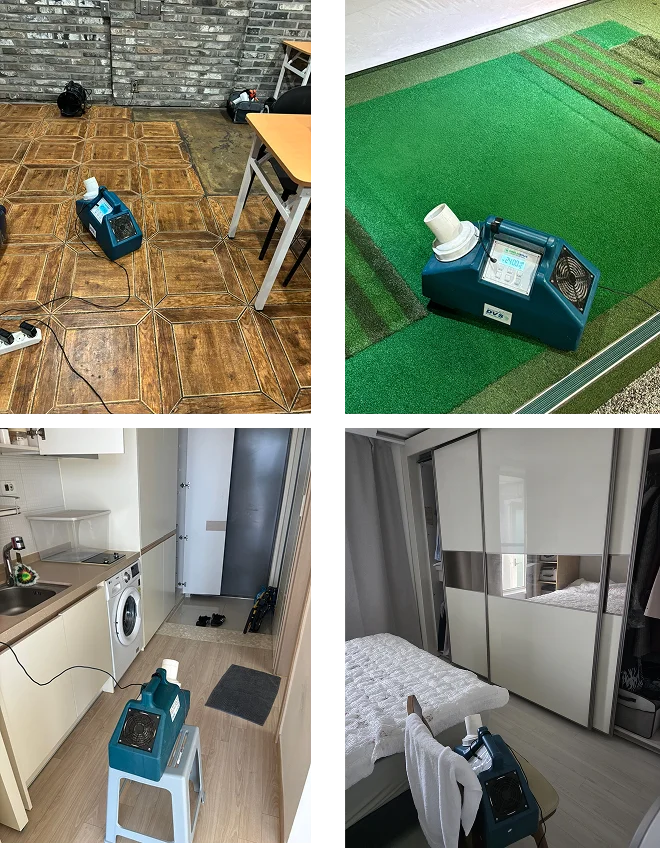 열기로 인해 공기 중에 부유한 분진을 집진기로 흡입하고, 천장과 벽, 가구 표면에 잔류하는 유해 오염물질도 송풍기로 제거합니다.