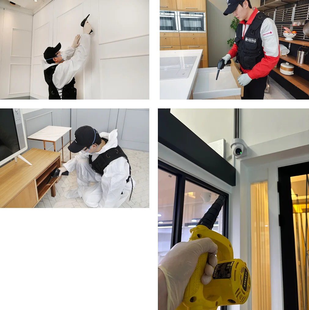 그렇기에 고객님들을 새집증후군으로부터 구해드리기 위해, 4가지 새집증후군 시공을 1박2일 동안 정성을 다해 한 번에 모두 제공하고 있습니다. 각각의 시공이 무엇인지와 어떻게 진행되는지 소개해드립니다.