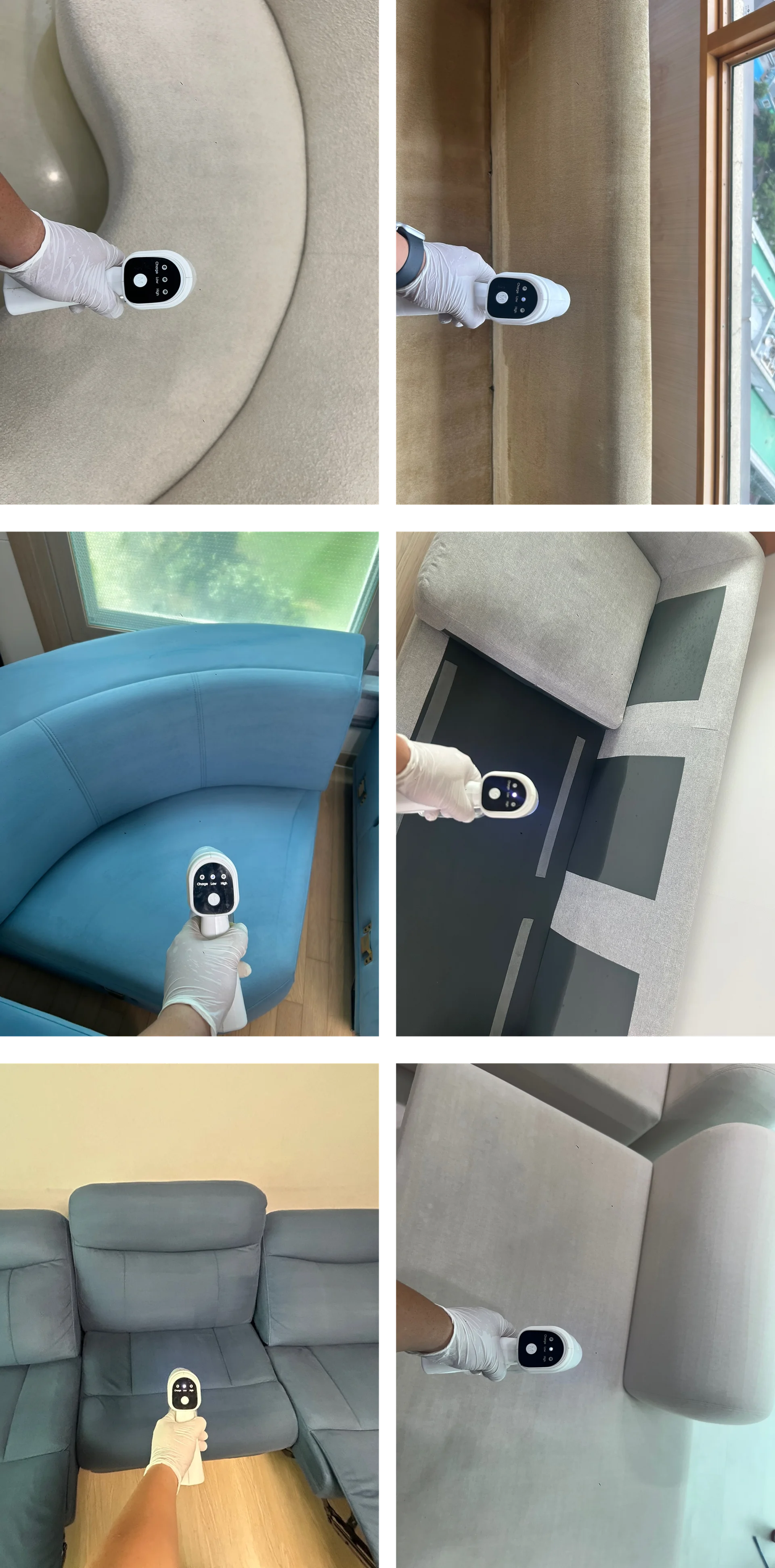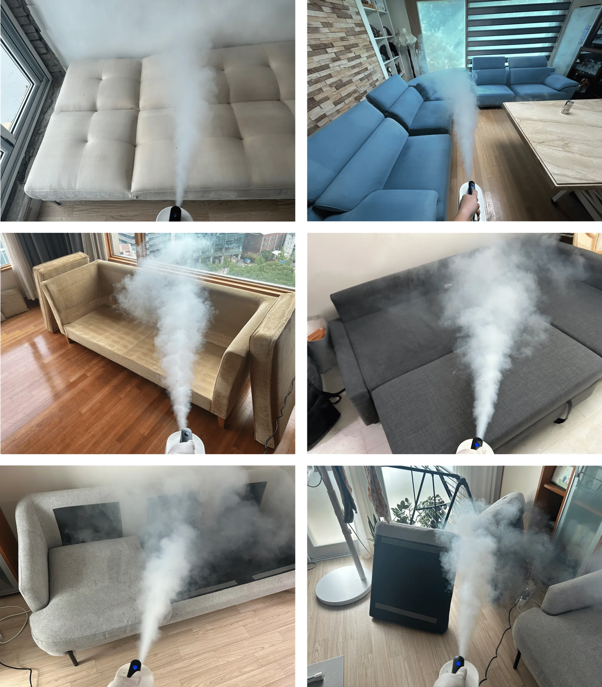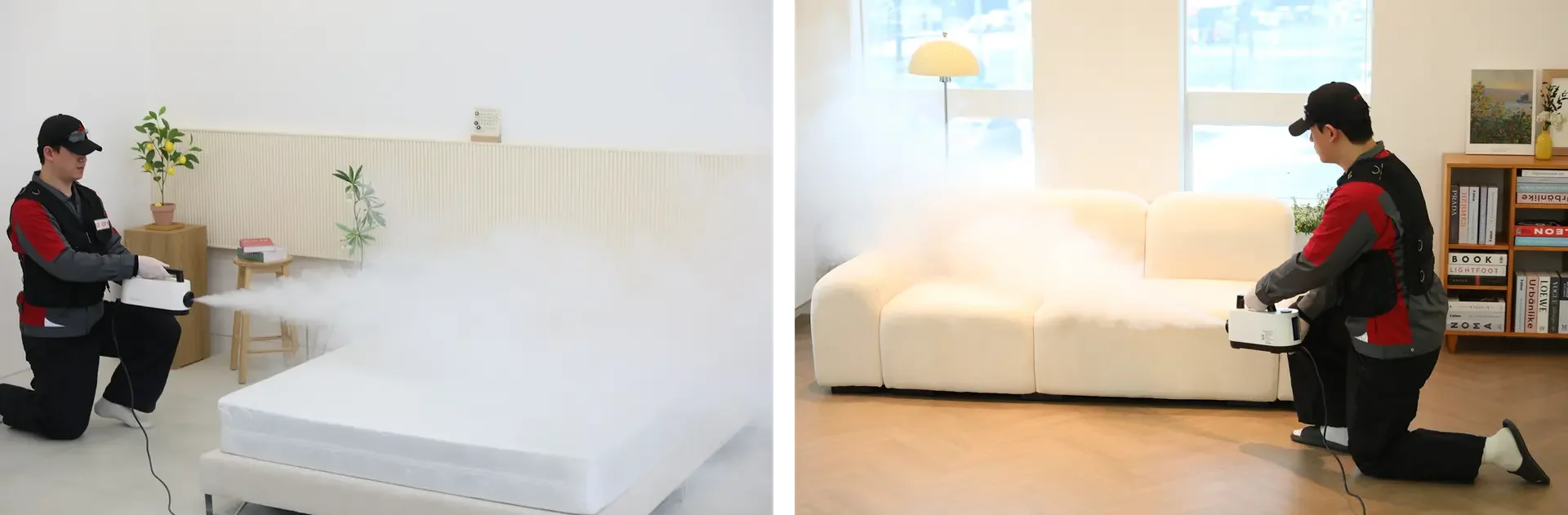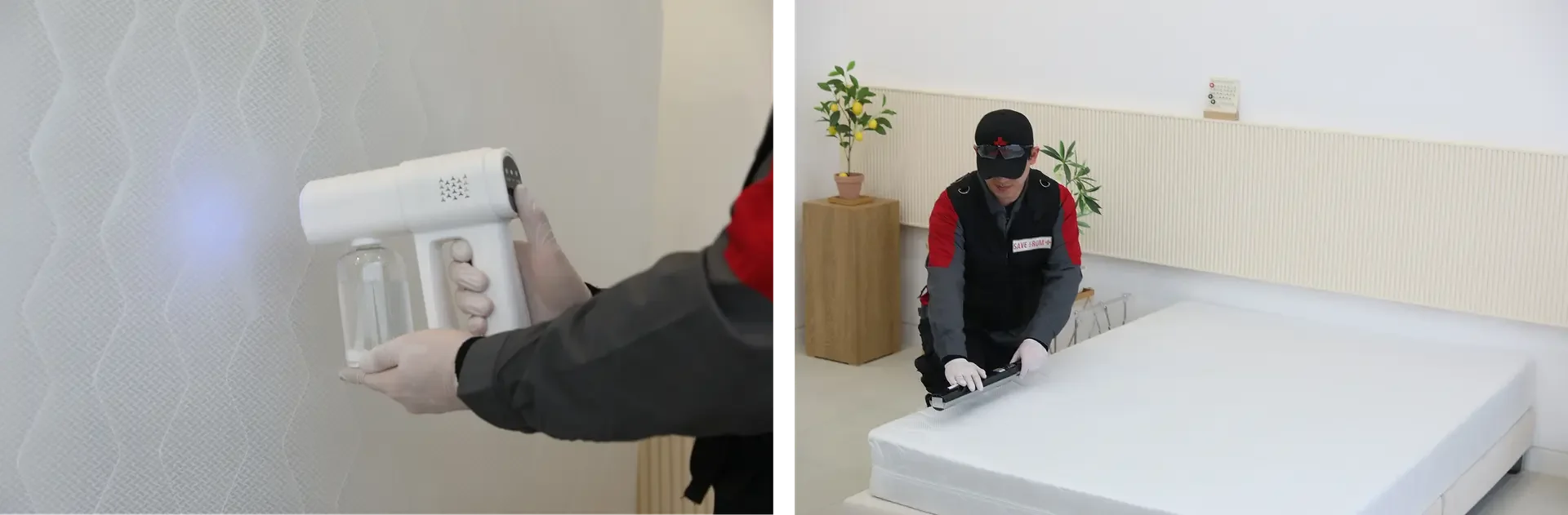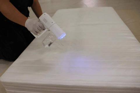 UV자외선 살균기와 전문약품 분무소독을 통해 매트리스와 소파 표면의 세균과 바이러스를 효과적으로 제거하는 과정입니다.