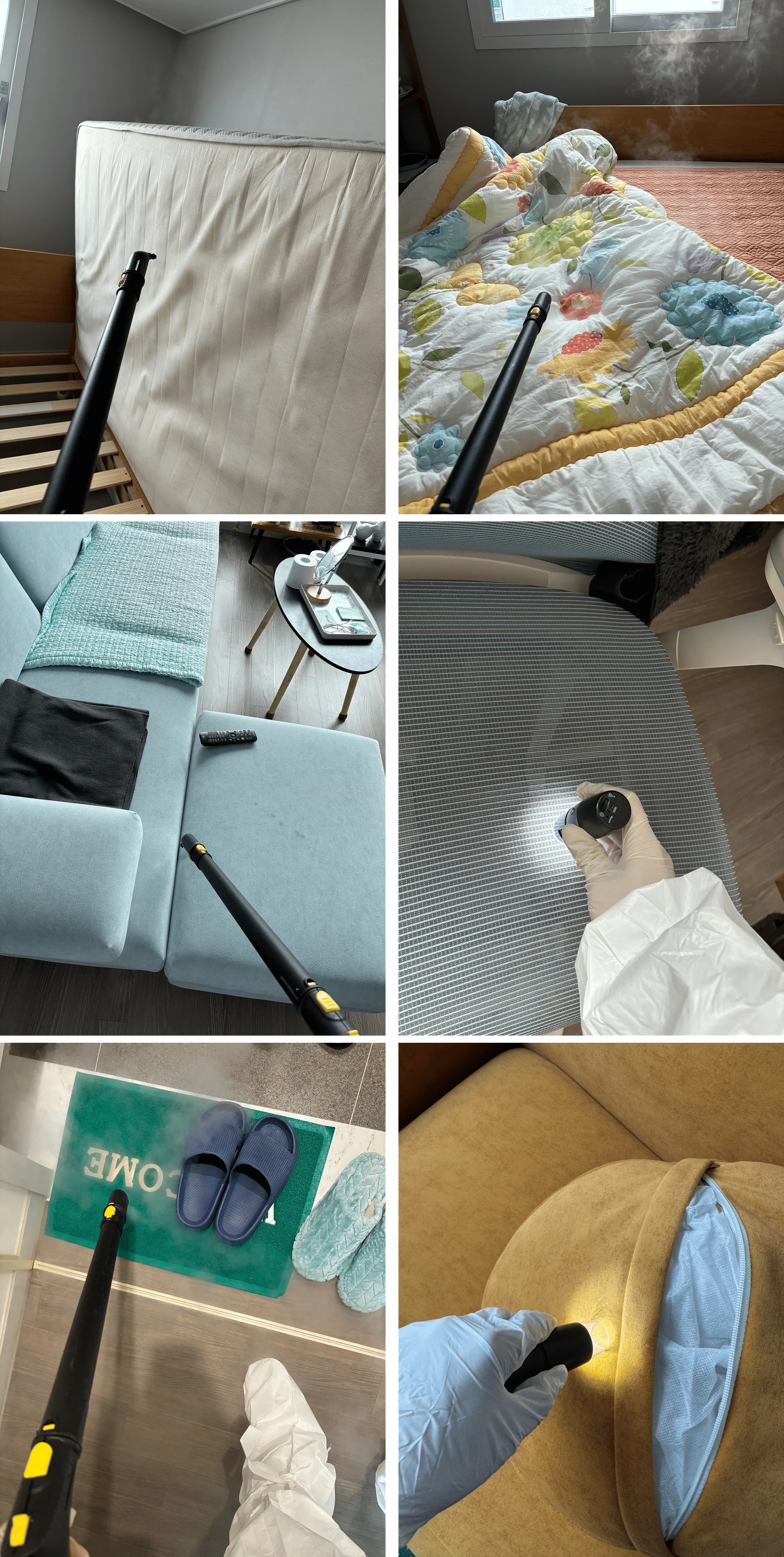 커피, 주스, 반려동물 오염 등 고착된 얼룩을 제거뿐만 아니라, 진드기 서식지에는 고온 스팀, 세균 번식이 심한 곳은 살균·탈취, 빈대 발생 의심 시, 특화된 고온 처리와 잔류 방제 병행합니다.